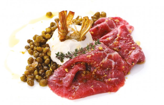 Lamelle di seppia cotta a bassa temperatura su crema di piselli, finti piselli al taleggio di bufala e croccante al nero di seppia