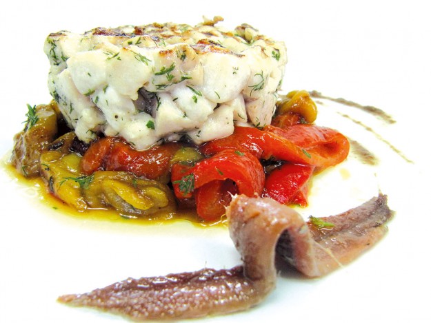 INGREDIENTI per 4 persone g. 520 di filetto di ricciola, g. 1 peperone rosso, g. 1 peperone giallo, g. 1 peperone verde, g. 5 filetti di acciuga, 1 noce di burro, ½ spicchio d’aglio, olio extravergine di oliva q.b., 2 cucchiai…