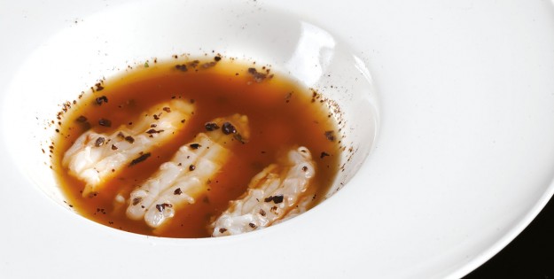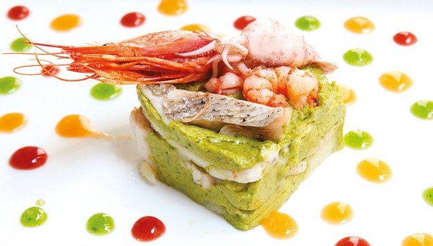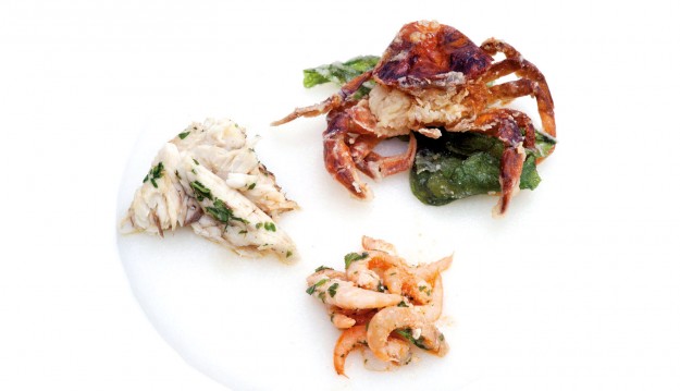INGREDIENTI per 4 persone g. 300 di schille e gamberetti di laguna g. 150 sgusciati), 4 moleche, 1 cefalo “Bosega” di g. 600, alghe, lattughe di mare, polenta bianca fresca tenuta all’onda preparata…
