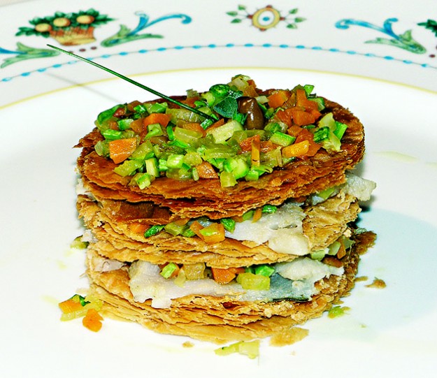 Ingredienti per 4 persone: sfoglia per realizzare 4 sfogliette, 1 filetto di cefalo, g. 200 di aceto di mele, 2 scorze d’arancio. Per la marinatura: 1 scalogno tritato, 1 spicchio d’aglio, insalatina di campo, olio extra vergine d’oliva quanto basta.…