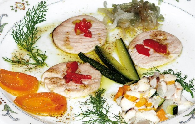 Ingredienti per 4 persone: kg. 2 di leccia, g. 200 di patate circa, 2 cipolle rosse di Tropea, g. 200 di zucchine, olio extravergine d’oliva, aceto balsamico, g. 200 d’insalata di campo, 4 pomodorini ciliegini, basilico, sale e pepe quanto basta.…