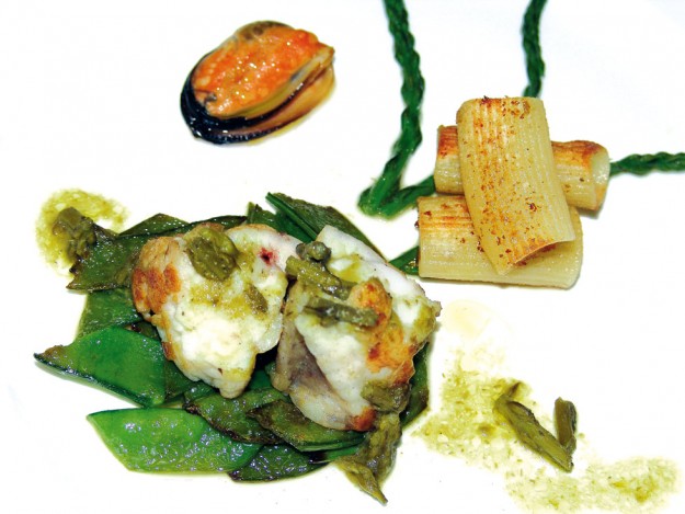 Ingredienti per 4 persone: 1 rana pescatrice di kg. 1,5 circa, 12 cozze, 12 maccheroni grandi, g. 150 di taccole (piselli mangiatutto), 1 mazzetto di asparagina selvatica, aglio, scalogno, sale, pepe, olio extravergine di oliva q.b. Preparazione: pulire e sfilettare…