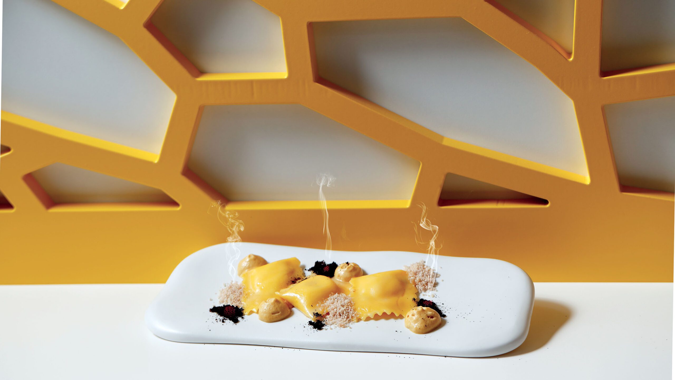 Incidere le castagne e cuocerle come si fa con le caldarroste. Una volta cotte, sbucciarle, macinarle e setacciarle fino ad ottenere un composto molto fine. Frullare l’uovo con un pizzico di sale ed emulsionare con il burro nocciola; inserire poi il composto ottenuto, ancora caldo, in un sifone. Cuocere in abbondante acqua salata gli Agnoli, scolarli e saltarli con il burro e il parmigiano. Posizionare gli Agnoli su un piatto di servizio, realizzare alcuni punti di spuma con il sifone ed alcuni punti con le caldarroste setacciate. Prendere qualche punto di polvere di caffè e posizionarli nel piatto dove, con l’ausilio di un cannello, daremo fuoco alla polvere di caffè, in modo che, durante il servizio, si senta l’aroma e si veda il fumo del caffè.