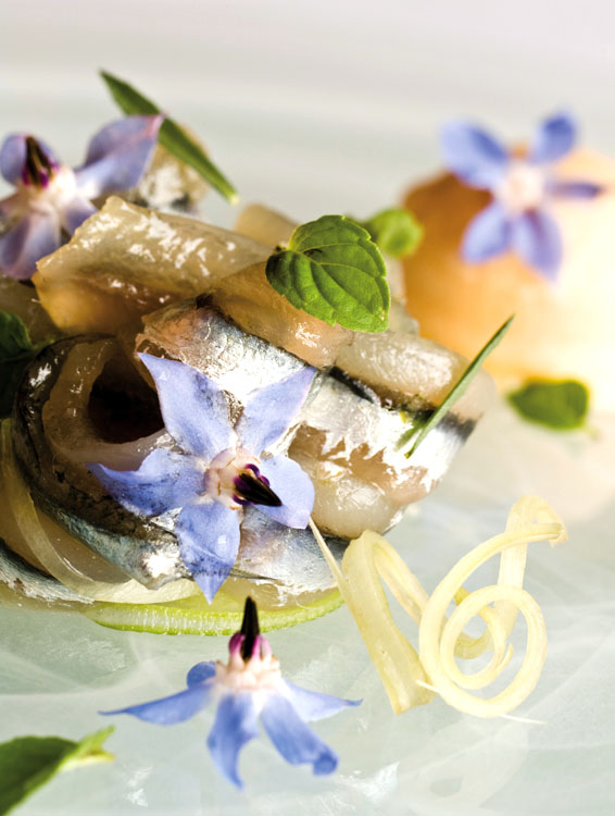 Per le alici: 40 piccole alici di lampara primaverili, g. 20 di rapatura di limoni, g. 20 di rapatura d’arancia, 40 steli teneri con foglia di timo, 30 foglie di menta, g. 40 di zucchero integrale di canna muscobado, g. 60 di fior di sale di Pirano fino, l. 0,5 di olio extravergine d’oliva carsolino.