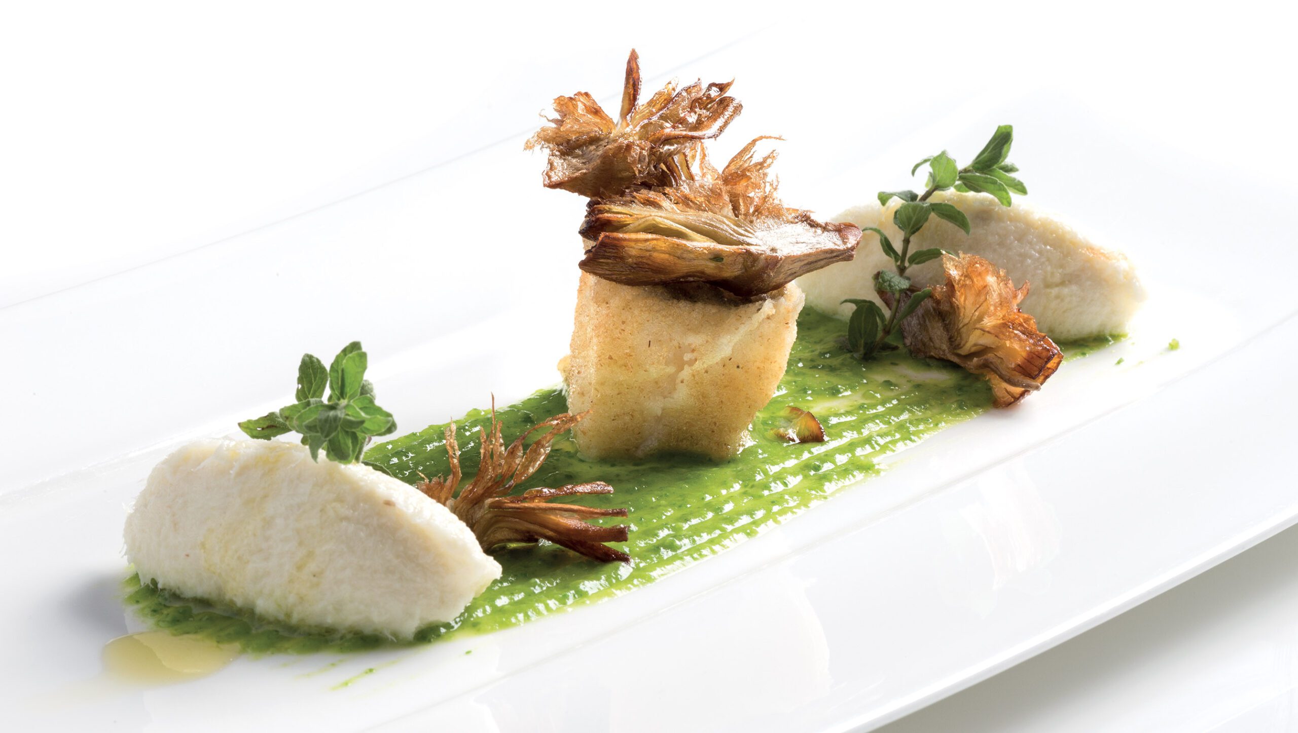 Dopo aver scaldato la passata di piselli, nappare con questa il piatto, eventualmente utilizzando un pettine per ottenere delle righe. Adagiarvi sopra il trancio di baccalà e, con il restante mantecato, realizzare due quenelle da disporre alle due estremità. Finire con i carciofi dorati e salati e, a piacere, decorare con un rametto di erbe aromatiche.