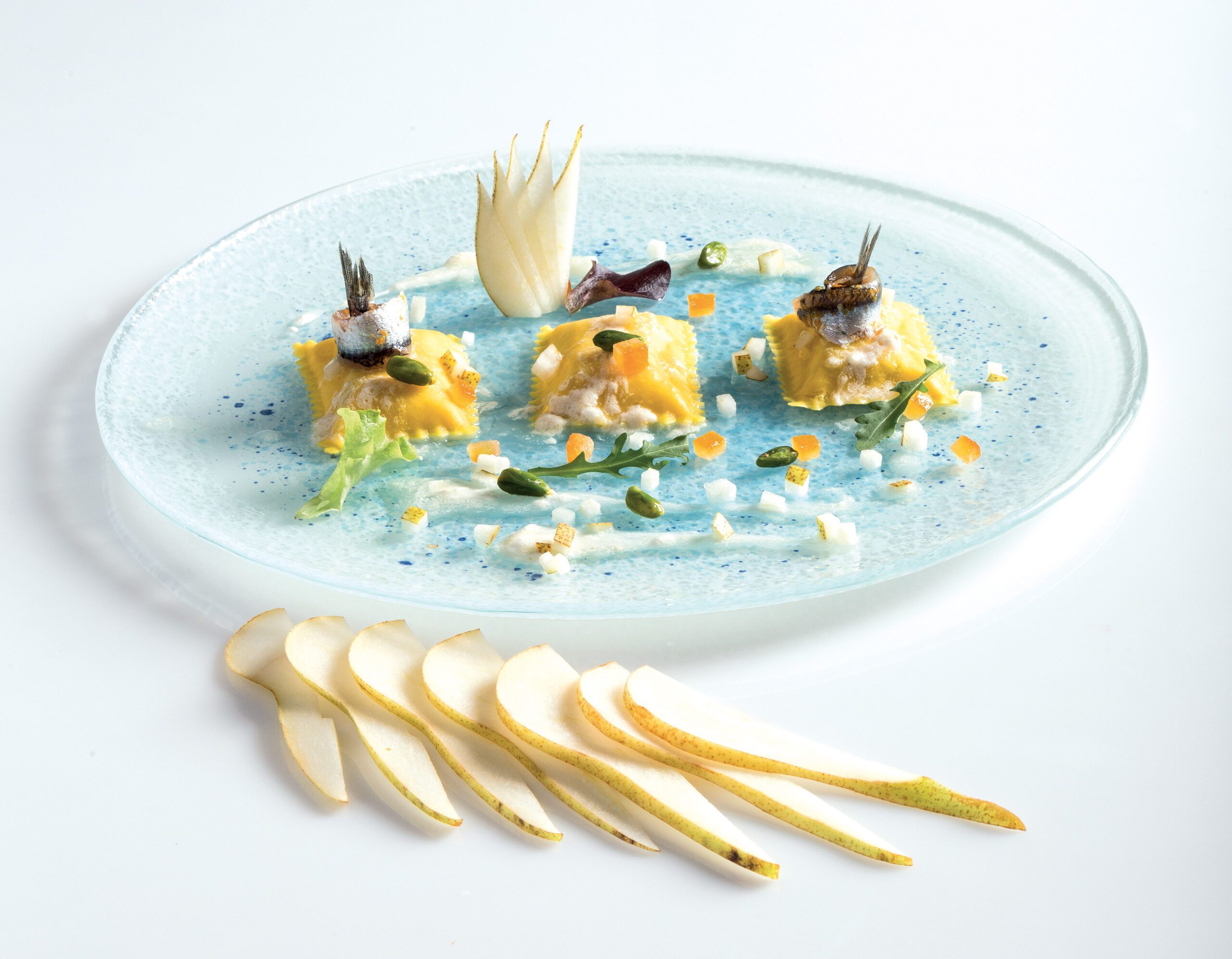 Posare i Bauletti su un piatto, arrotolare le alici e porle sulla pasta; finire con una dadolata di pera Williams, le zeste di arancia e pistacchio.