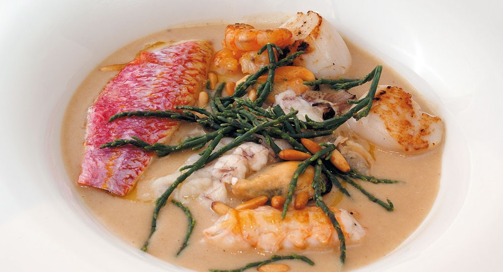 Pulire e sfilettare tutto il pesce, tenendo gli scarti che verranno usati per preparare il brodetto. Pulire le verdure, tagliarle a julienne e stufarle in pentola con l’aglio e le erbe aromatiche che toglieremo prima di aggiungere gli scarti del pesce. Tostare le teste dei crostacei in una pentola, sfumare con il vino e coprire con acqua fredda; bollire per 15 minuti e filtrare. Aprire le cozze e le vongole con aglio e prezzemolo, coprire con acqua e cuocere; pulire le conchiglie, tenendo separati i molluschi dal brodo. Coprire le verdure con il brodo delle vongole e quello dei crostacei, aggiungervi le patate e le seppie e far stracuocere; aggiungervi i pinoli alla fine; frullare il tutto al thermomix, aggiustando di sale e pepe e aceto di vino bianco; tenere al caldo. Per la presentazione, scaldare il pesce precedentemente arrostito in padella in forno a 120°C per non farlo asciugare, versare nel piatto il brodetto profumato ai pinoli, adagiarvi il pesce e i molluschi delle conchiglie, salare in superficie con cristalli di sale, olio extravergine e ciuffi di salicornia.