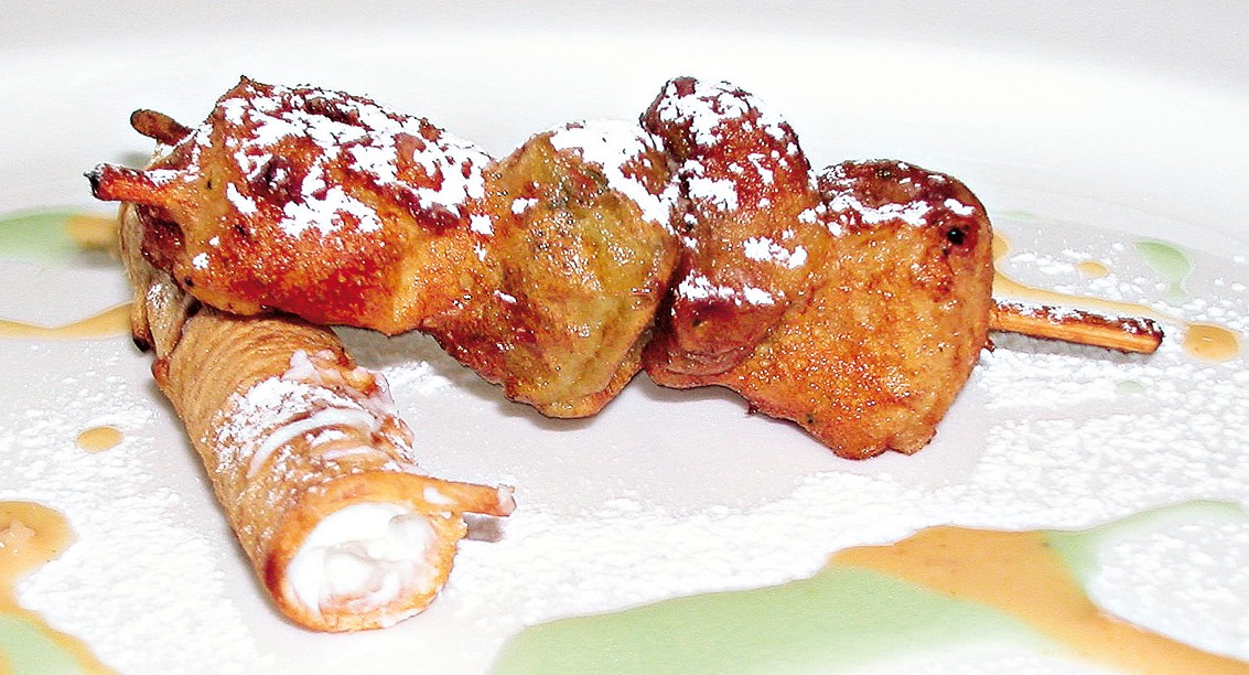 Procedimento: cuocere gli spaghetti e farli raffreddare. Imburrare dei tamponi da cannolo alla siciliana piccoli, arrotolare gli spaghetti e friggerli. Passare la ricotta al setaccio, condirla con lo zucchero e i canditi e mettere in frigo a riposare. Pelare la frutta e tagliarla a dadi da 1 cm di lato, montare gli spiedini utilizzando un rametto di rosmarino, passarli nella pastella e friggerli lentamente facendo attenzione alla cottura della frutta. Riempire i cannoli con la ricotta, montare il piatto con il cannolo di spaghetti freddo e lo spiedino di frutta caldo. Decorare con salsa inglese alla menta.