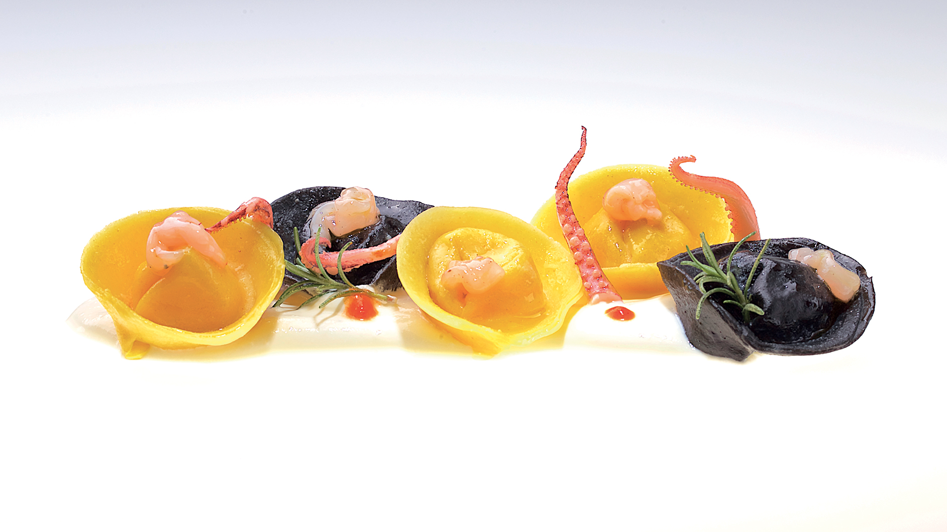 Per la pasta all’uovo al nero di seppia: g. 75 di semola di grano duro, g. 175 di farina 00, g. 175 di tuorli d’uovo, g. 25 di nero di seppia.