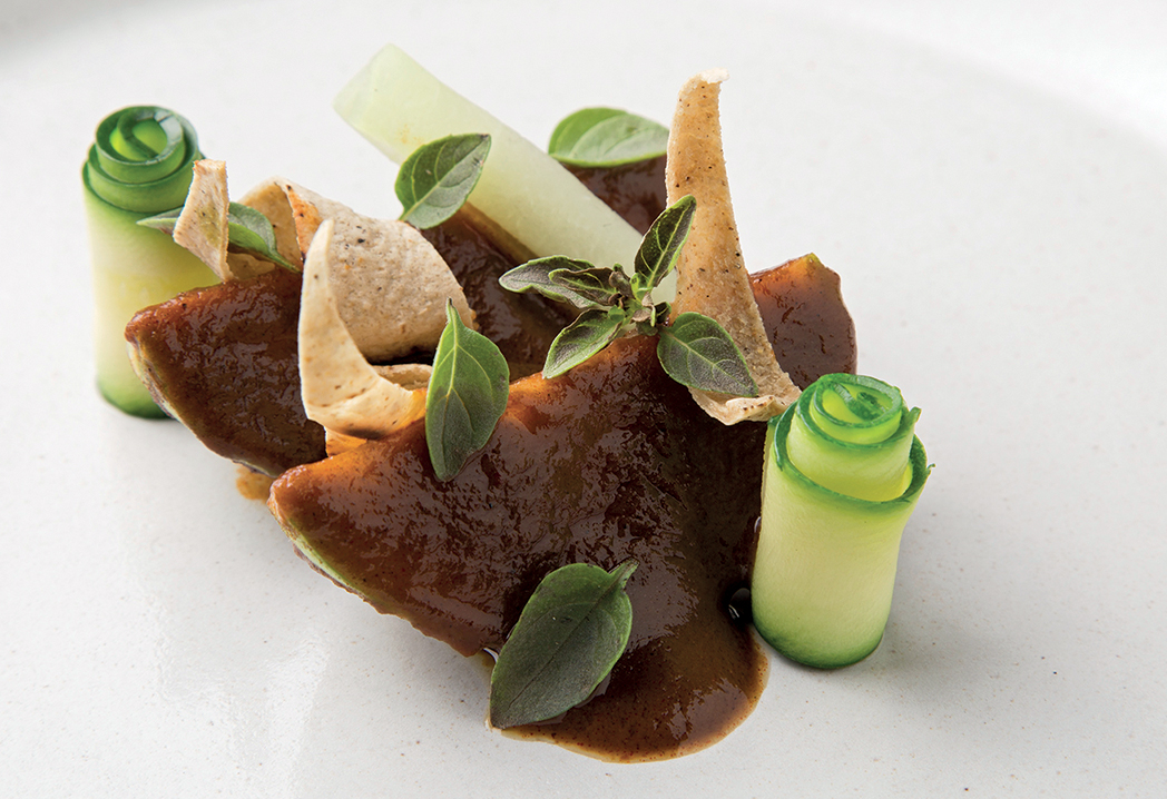 Con una laminatrice, ragliare a lamelle le zucchine e il chayote, metterli in acqua per farli diventare dei riccioli. In un piatto disporre una base con un poco di mole, accomodare i chilacayotes e i riccioli di zucchini e di chayote, collocarvi sopra tortillas abbrustolite e i germogli di diversi tipi di basilico.