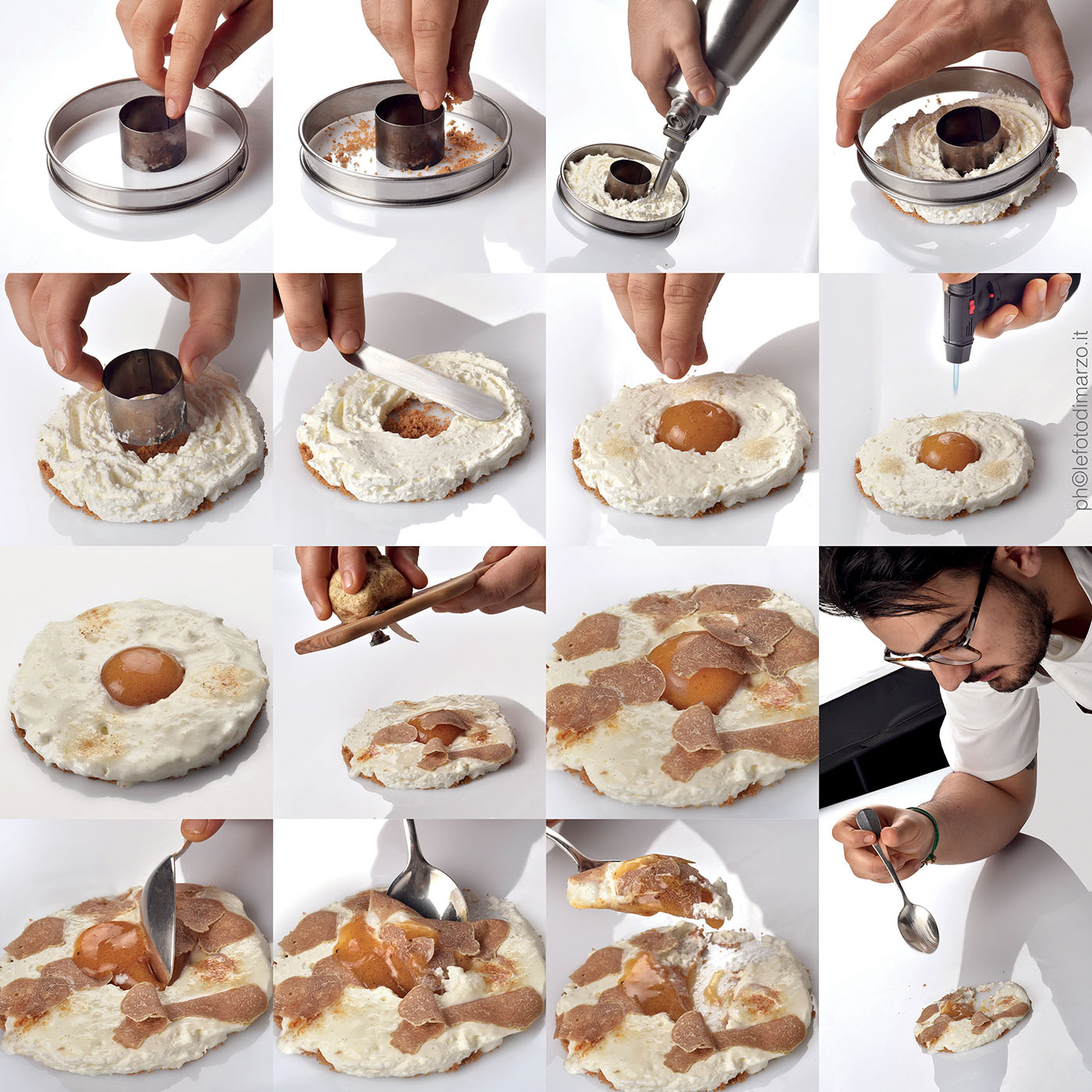 Mettere una coppa piatta al centro del piatto. Coprire l’interno con lo streusel di nocciole; mettere al centro la gelatina di caco, spumare nei contorni con il sifone il cioccolato bianco, spalmare con dello zucchero di canna e bruciare con il cannello dove c’è lo zucchero. Infine grattarvi generosamente il tartufo bianco.