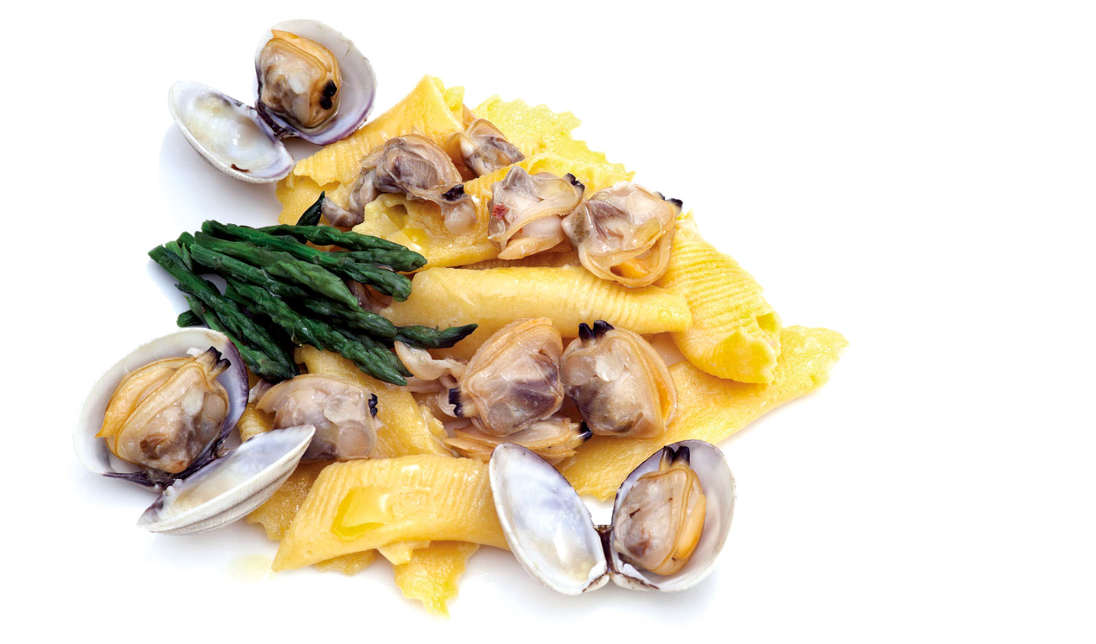Arrotolare i quadrati con l’apposito bastoncino sul pettine o sul rigagnocchi e formare i garganelli. Lessare i garganelli in acqua poco salata, scolarli dopo 2 minuti e terminare la cottura in padella con il solo liquido delle vongole.