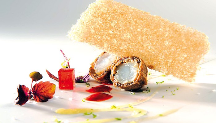 Tagliare i gamberi in 3 parti così da far vedere la cottura madreperlata; presentarli con attorno qualche punta di salsa tandoori; depositare il caffè latte croccante sopra i gamberi, un cubo di gelatina di Campari e un po’ di caviale di melanzane.