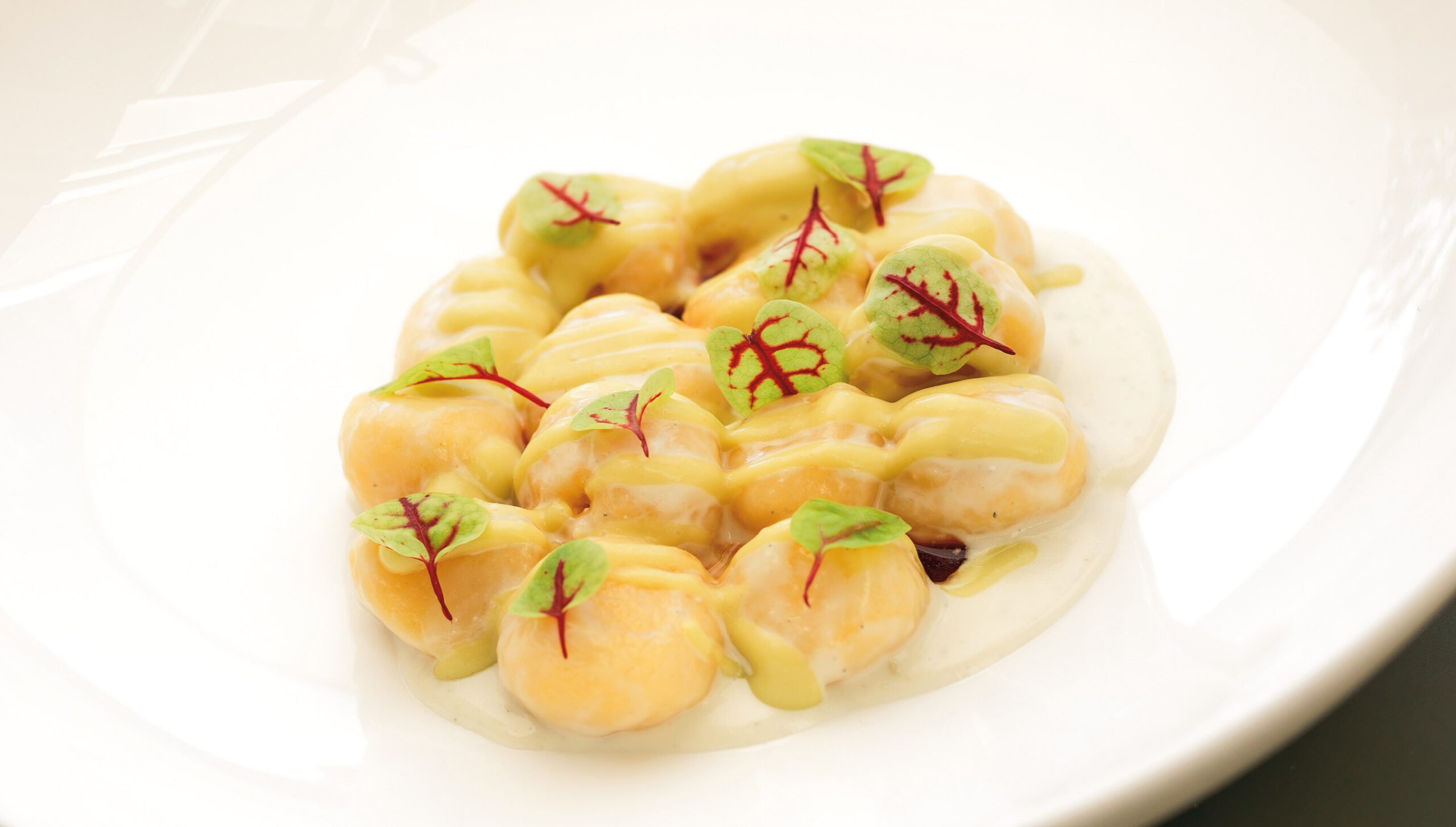 Far bollire l’acqua in un pentolino, buttare gli gnocchi, scolarli e saltarli in pentola con un po’ di salsa di blu di bufala. Riporli al centro del piatto, guarnire con salsa di soia e guacamole.