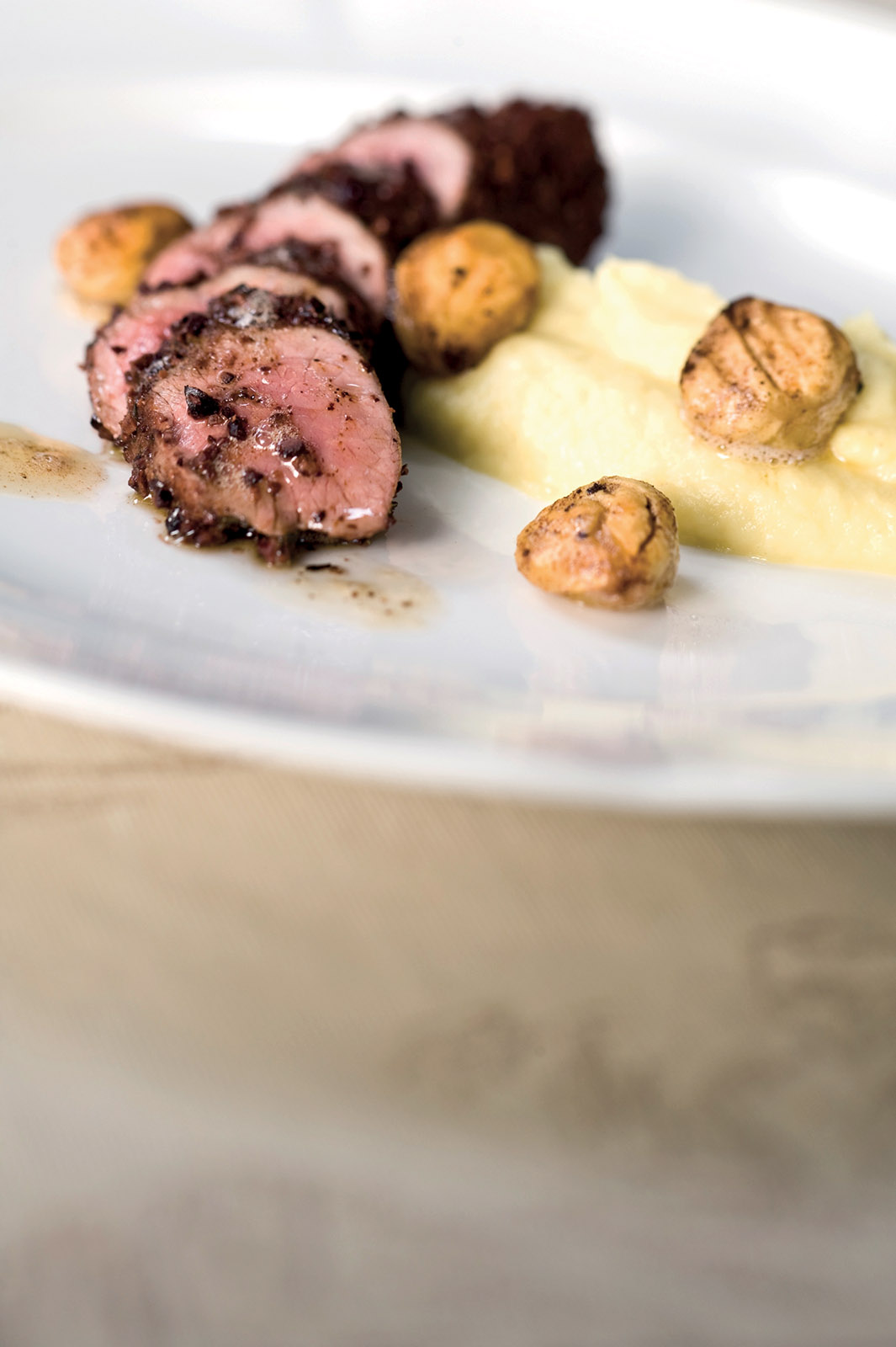 Scaloppare la sella e disporla su un piatto piano a scalare. Condire con un filo del suo burro di cottura, guarnire con le castagne e accompagnare la carne con una generosa cucchiaiata di purè.