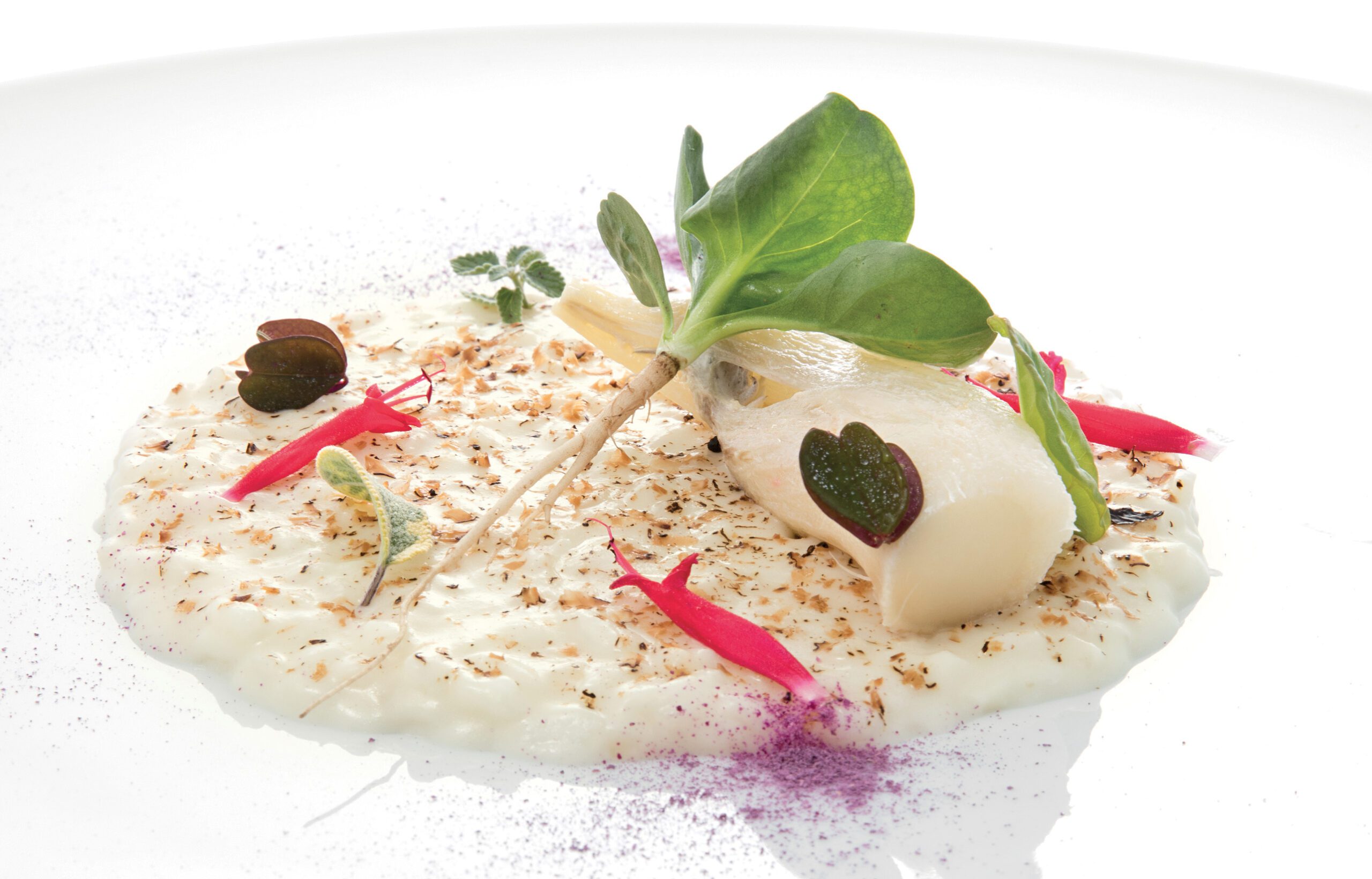 Per il risotto: g. 200 di riso Carnaroli Riserva San Massimo, g. 80 di brunoise di sedano rapa tagliata a 2 mm., g. 30 di burro, g. 5 di scalogno, g. 20 di burro, g. 10 di crema di cardo, g. 10 di crema sedano rapa, 1 fava di Tonka.