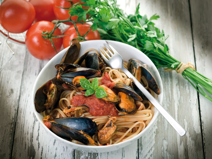 Linguine, cozze, pomodorini, basilico, aglio, peperoncino, olio extravergine di oliva.