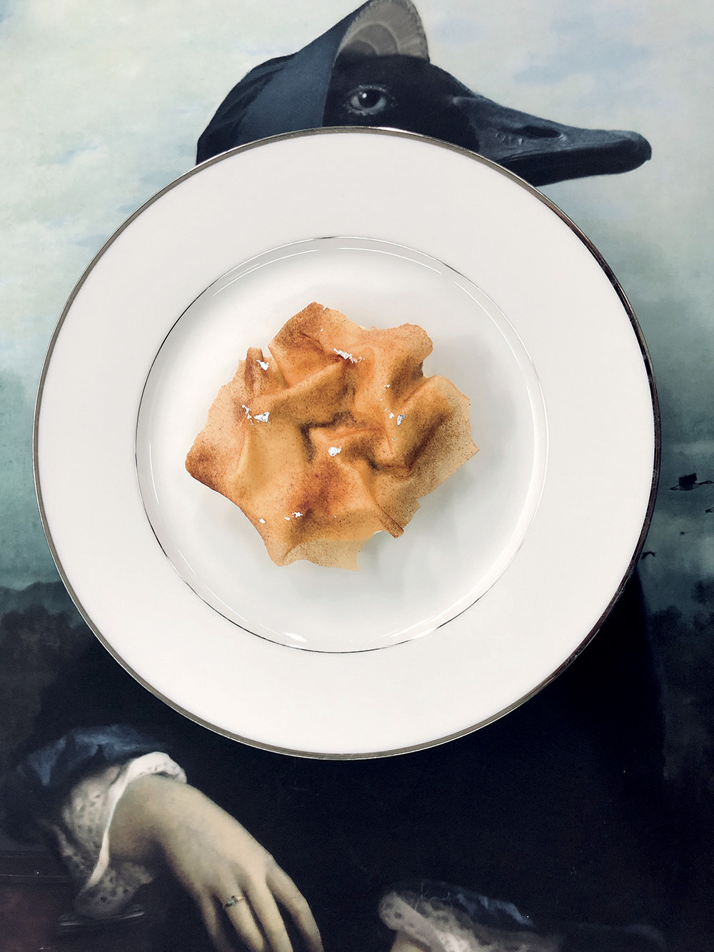 Per la sfoglia croccante: mettere in un sacchetto sottovuoto 6 mele pulite e tagliate a pezzi; cuocere a 95°C a vapore per 20 minuti. Successivamente frullare nel Bimby, aggiungere il glucosio in polvere, stendere la purea di mela sopra a un Silpat, asciugare in forno a 50°C per 3 ore. Creando delle sfoglie di mela, tagliare dei quadrati di cm. 10×10. Ripassarli in forno a 180°C per 2 minuti dandogli una forma irregolare. Spolverare con lo zucchero Carafin e dei pezzetti di foglie d’argento alimentare.