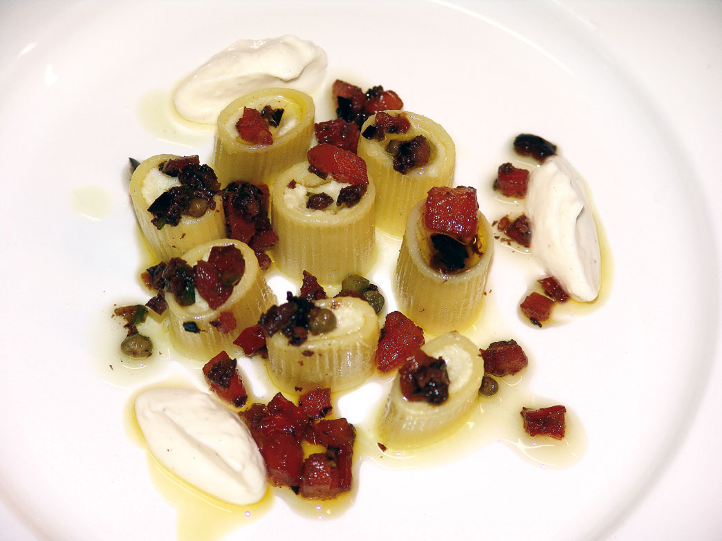 Preparazione: cuocere il baccalà a vapore aromatizzandolo con la maggiorana; eliminarvi la pelle e le spine e finire di cuocere sul fuoco con olio, aglio e acqua. Far riposare, poi filtrare. Mettere il baccalà nel mixer e frullare, aggiungendovi la panna e un po’ d’olio (oppure gelatina di baccalà), aggiustare di sapore e mettere il composto in una tasca da pasticceria. Cuocere le mezze maniche in abbondante acqua salata per circa 8 minuti, poi scolarle e lasciarle raffreddare aggiungendovi un filo d’olio. Riempirle con il baccalà. In una padella scaldare l’olio con l’aglio e lo scalogno, unirvi i pomodori e le olive nere denocciolate e tritare. Controllare la sapidità. Disporre le mezzemaniche farcite nei piatti e salsare con i pomodori, olive e capperi.