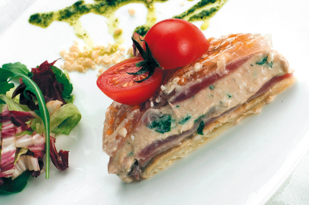 g. 600 g di tonno rosso fresco, 2 limoni, cl. 5 d’olio d’oliva, 2 cucchiai di olio di sesamo, 1 cucchiaino di sale, g. 50 di miscela di 3 tipi di pepe, 1 cucchiaino di bocciolo di rosa in polvere, 2 cucchiaini di zenzero macinato, g. 500 di pasta sfoglia, g. 50 di pinoli macinati.