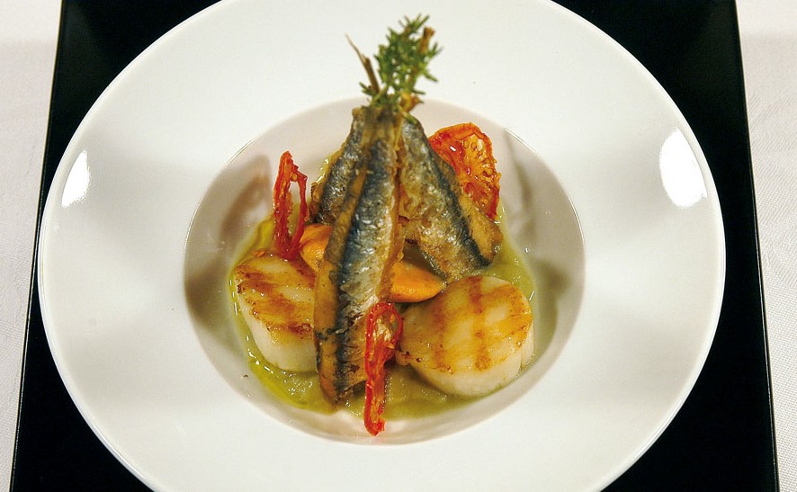 Pulire le cappesante, lavarle e asciugarle. Salarle e peparle, cuocerle su di una griglia ben calda. Mettere al centro dei piatti un poco di purea di melanzane, adagiarvi sopra le cappesante grigliate, e i sardoncini fritti con le estremità dei bastoncini che si sostengano uno con l’altro in modo da formare una specie di “capanna”. Guarnire con le fettine di pomodoro essiccate e servire con un filo d’olio crudo.