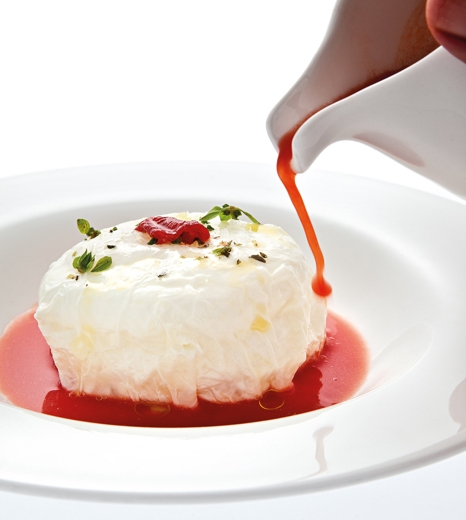Per la spuma di mozzarella: g. 400 di mozzarella di bufala, g. 200 di latte, g. 220 di panna fresca, sale.