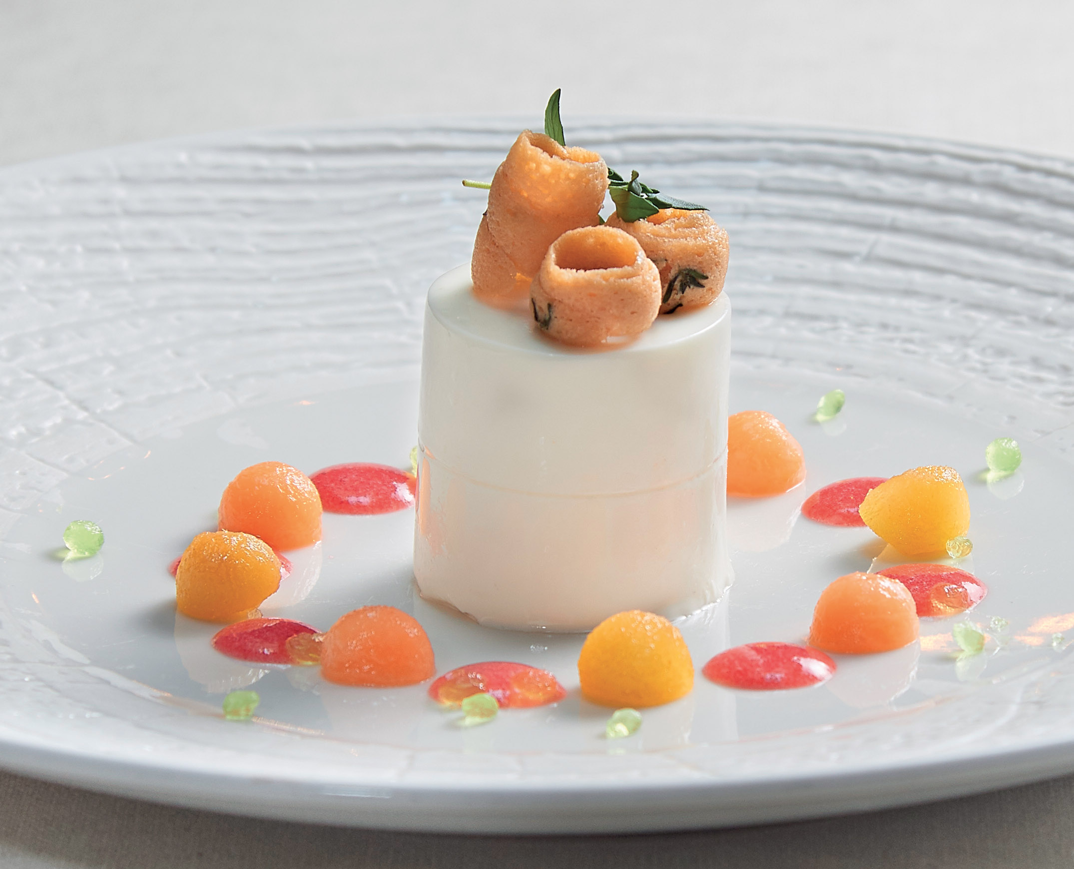 Frullare e filtrare tutti gli ingredienti. Comporre il piatto e guarnire con melone fresco.