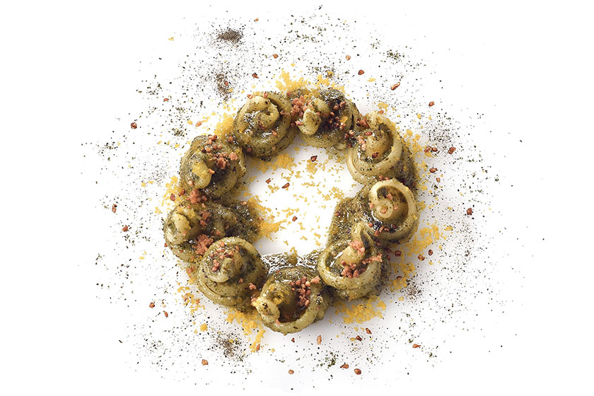 In cottura: preparare una base di brodo di pesce e calarci dentro la pasta, facendo attenzione a non farla attaccare. Durante la cottura, iniziare ad insaporire il tutto aggiungendo, poco per volta, dell’olio EVO, della colatura di alici e del pepe nero macinato fresco. Continuare ad aggiungere brodo di pesce se necessario, ma non troppo. A cottura ultimata, spegnere il fuoco e mantecare la pasta con del burro all’acciuga, del pecorino, le tre tipologie di alghe in polvere, della bottarga di tonno e di muggine grattugiata e sistemare di sapore.