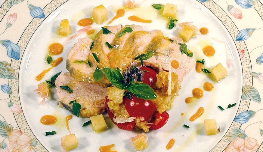 Preparazione: per la panzanella far rinvenire il pane a bagno in acqua fresca per circa 2 ore, quindi strizzarlo in modo da eliminare tutta l’acqua.In una ciotola mettere i pomodori tagliati grossolanamente, i cipollotti tagliati a fettine sottili, il basilico e il pane. Condire il tutto con l’aceto, l’olio, il sale e il pepe. Mescolare bene e far riposare per almeno 1 ora. A questo punto unirvi la mozzarella tagliata a cubetti e amalgamare. Coprire i petti di faraona con il sale grosso e lasciarli “cuocere “ nel sale per circa 45 minuti. In un tegame mettere tanto olio quanto sia sufficiente per coprire in seguito i petti di faraona, unirvi tutte le erbe aromatiche e portare a 85°C. Immergervi i petti di faraona tolti dal sale, lavati e asciugati molto bene. Cuocere per 20 minuti controllando con l’aiuto di una sonda di mantenere l’olio a 85°C costanti. Togliere dal fuoco e far raffreddare i petti nell’olio. Scolare i petti dall’olio, asciugarli e tagliarli a fettine, disporli nei piatti con accanto un poco di panzanella. Condire con olio e con un poco di panzanella che avrete precedentemente frullato e passata al setaccio.