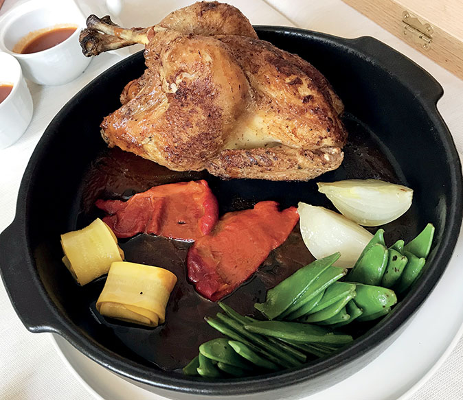 1 pollo, olio evo, aglio, rosmarino, salvia, g. 100 di burro, abbinamento di ortaggi secondo la stagione.