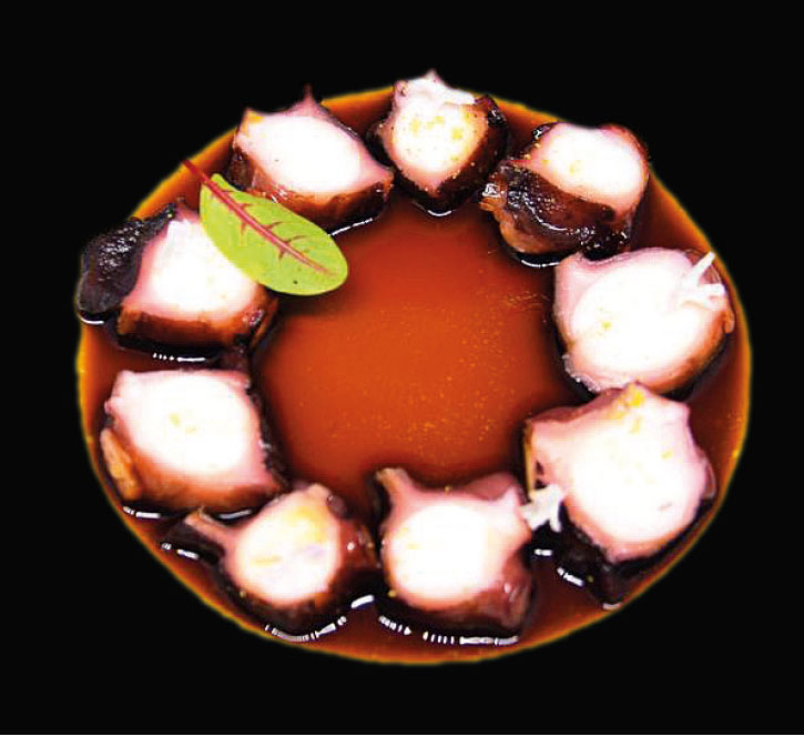Successivamente filtrare l’essenza di farona e bilanciare la sapidità aggiungendo l’acqua che avrà rilasciato il polpo durante la cottura. Arrostire i tentacoli di polpo in padella rovente con un filo d’olio extravergine per qualche minuto. Tagliare i tentacoli a petali.