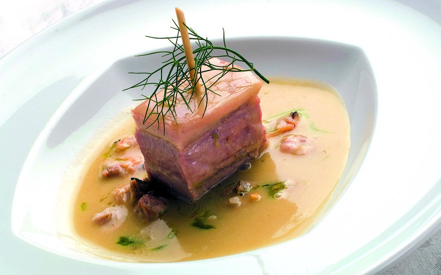 Pulire le arselle e farle aprire in padella con un trito di aglio e prezzemolo, sfumare con il vino bianco e coprire con il coperchio; spegnere il fuoco e lasciare chiusa la pentola per 10 minuti. Filtrare il liquido di cottura e sgusciare le arselle, aggiungere l’erba cedrina tagliata molto sottile ed il sedano privato dei filamenti, tagliato a julienne (pepare solamente, in quanto l’arsella è già salata e servirà a dare salinità al piatto). In una griglia in ghisa molto calda, far dorare la cotenna del maiale. Sistemare al centro del piatto le arselle, sopra le 2 pancette e finire il piatto con il liquido di cottura delle arselle.