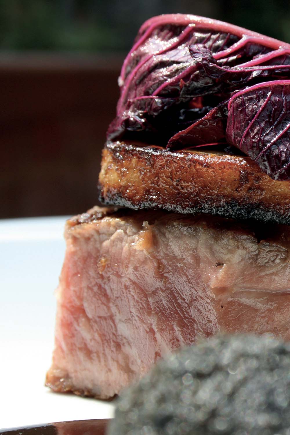 Aggiungere il fondo bruno di vitello. Fare ridurre ulteriormente fino ad ottenere una salsa spessa e “sciropposa”, aggiungere i fegatini passati ed un setaccio, spegnere il fuoco, aggiustare di sale e condire con il burro. Tenere in caldo.