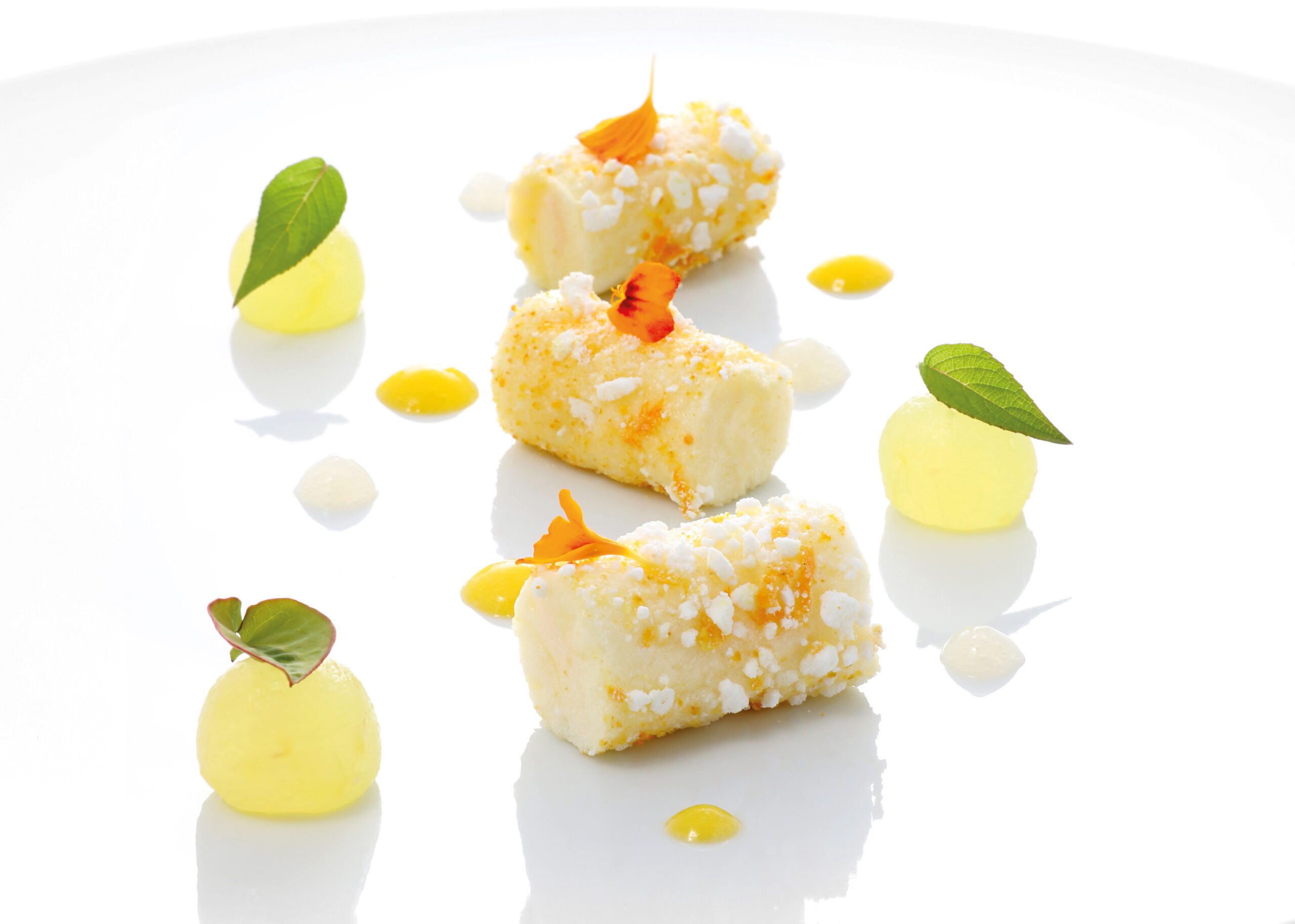 Portare a bollore acqua e zucchero, sciogliere la colla di pesce, poi versare sulla purea. Raffreddare in acqua e ghiaccio e conservare in frigorifero sottovuoto. Quando raggiunge una consistenza gelatinosa, montare e versare negli appositi stampi. Abbattere e conservare in congelatore.