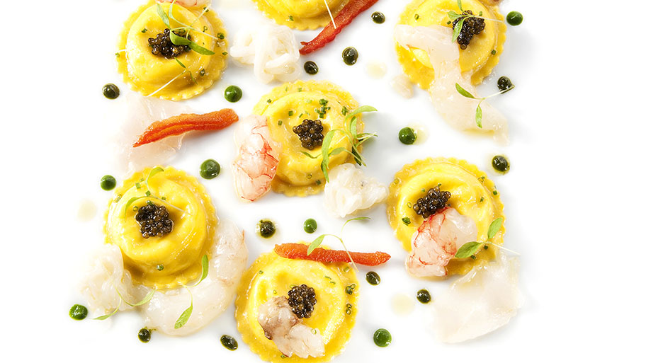 g. 200 di pasta per ravioli, 3 calamari, 4 gamberi, 8 scampi, 8 lamelle di branzino crudo, 8 lamelle di dentice crudo, caviale Sevruga q.b., julienne di pomodoro confit q.b., olio extravergine d’oliva q.b., burro q.b., erba cipollina q.b., g. 20 di prezzemolo, olio di prezzemolo q.b., germogli q.b.