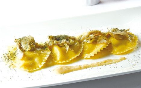 Cuocere i Raviolotti al baccalà per 30 secondi in acqua bollente salata, scolarli e versarli velocemente nel piatto. Coprirli con i carciofi ancora caldi e completare con righe di salsa all’aglio rosso.
