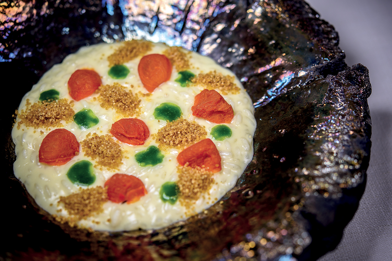 Stendere il risotto in 4 piatti piani ben caldi, appoggiare sopra i pomodorini, condire con gocce di clorofilla e bottarga di coregone.