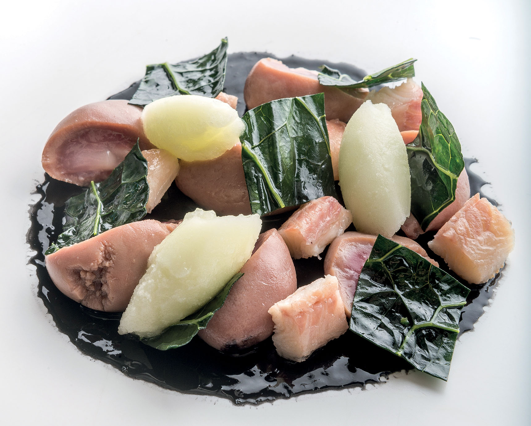 Per il gelato, cuocere le zucchine trombetta sottovuoto con olio e sale per 20 minuti a 70°C. In una pentola mettere 300 grammi di vino bianco, 300 grammi di aceto, 100 grammi d’acqua, 30 grammi di zucchero, alloro, pepe in grani. Sbollentare per 10 minuti; aggiungere le zucchine e cuocere per altri 10 minuti. Frullare il tutto e fare un gelato. Impiattare mettendo come base la crema di anguilla al nero di seppia, i rognoni, i dadini di anguilla, la foglia di cicoria e i cucchiaini di gelato.