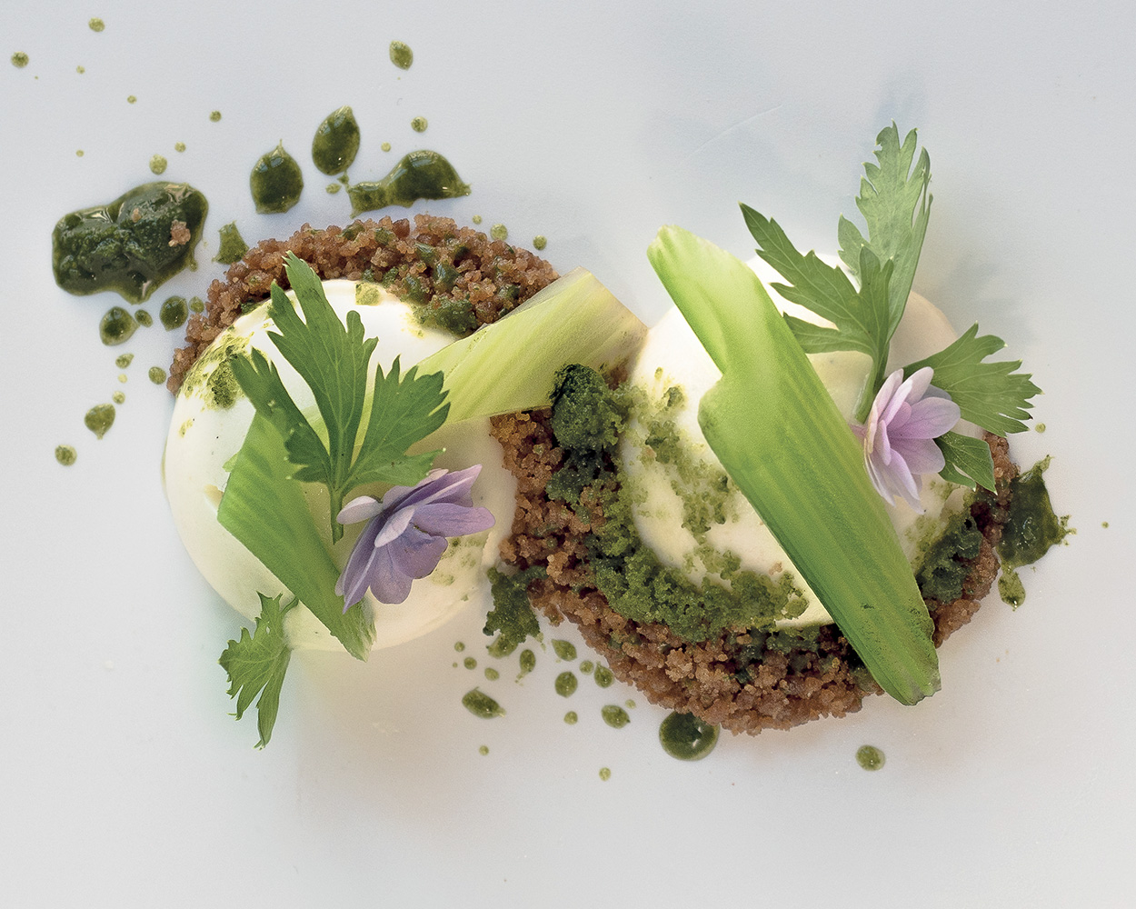 Posizionare le due semisfere di sedanorapa sul piatto, mettervi sopra la terra al malto, il sedano candito, i fiori eduli, le foglie di sedano e terminare con la granita di levistico.