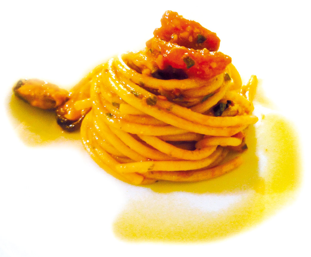 Sgusciarle tenendo da parte il liquido di cottura.Fare un pesto di pinoli, basilico e abbondante olio extravergine d'oliva. Tagliare a pezzi i pomodori Pachino e versarli in una pentola nella quale andranno aggiunte le cozze con il loro liquido. Unire gli spaghetti cotti molto al dente. Prima che il liquido delle cozze sia completamente evaporato, aggiungere il pesto di pinoli e basilico e mantecare.