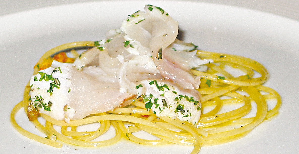 Ingredienti: g. 150 di Spaghetti Selezione Oro Chef Barilla, g. 30 di fiori di zucchine, g. 30 di peperoni rossi, g. 5 di erbe aromatiche tritate (rosmarino, salvia), cl. 3 di olio extra vergine d’oliva, 1 spicchio d’aglio, poco prezzemolo, g. 200 di filetto di cernia, g. 4 di sale, g. 1 di pepe.