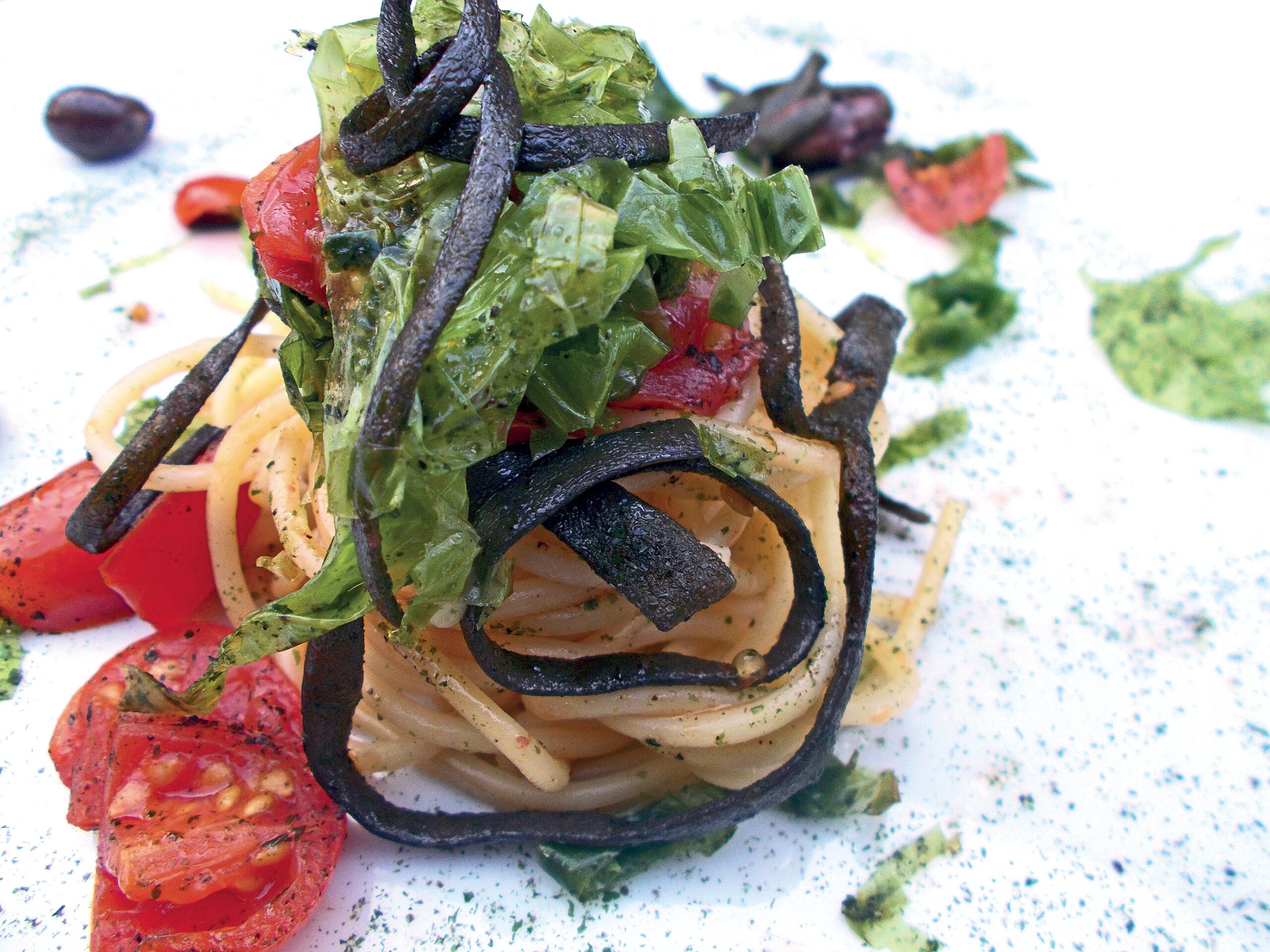Scolare gli spaghetti al dente e metterli nella padella col pomodoro; aggiungere il brodo vegetale e terminare la cottura in padella. Quando saranno men amalgamati col sugo, aggiungere acqua di mare, le alghe tagliate julienne e le olive. Emulsionare con olio evo e impiattare un bel nido, infine decorare con la polvere di alga Nori.