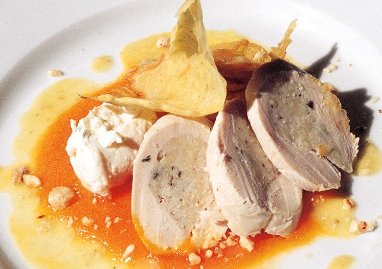 Procedimento: nettare il petto di pollo e tagliarlo in due pezzi nel senso della lunghezza, quindi aprire i due filetti a libro senza staccare i pezzi. Per la farcia del pollo, frullare il pane con la panna, la polpa di pollo e il primo sale ottenendo un impasto fine, aggiungendo le olive tritate. Salare e pepare. Per le quenelle di ricotta, frullare la ricotta infornata con un po’ d’olio e sale, aggiungere la maggiorana e aiutandosi con due cucchiai formare delle quenelle. Mettere in caldo. Cuocere la pasta con il brodo di pollo come un risotto, condire con pecorino grattugiato e lasciare raffreddare. Mescolare il risone con la farcia di pollo e aggiungere il basilico tritato, farcire il petto di pollo e avvolgere in carta da forno bagnata nel vino bianco stringendo forte e poi avvolgere nella carta stagnola. Cuocere a 100°C in forno misto per 20 minuti circa, temperatura al nucleo 65°C. In una casseruola con un po’ d’olio stufare lo scalogno e l’aglio, aggiungere la zucca tagliata a quadretti e lasciare cuocere per 20 minuti circa. Salare e pepare. Non appena la zucca è cotta, frullarla con il rimanente olio. Cuocere i capellini in abbondante acqua salata, scolarli e raffreddarli velocemente. Quindi con una forchetta ricavare 4 ciuffi e friggerli in abbondante olio.