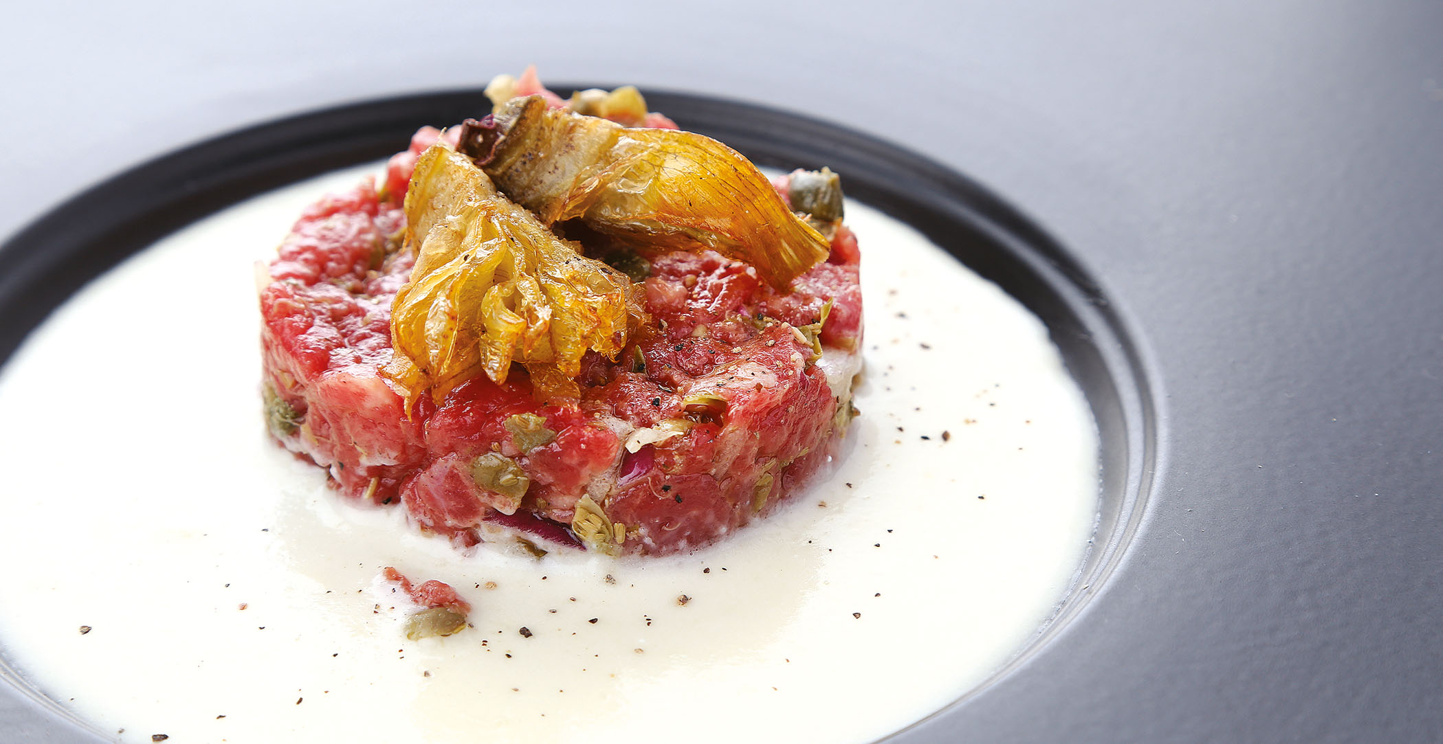 Per la tartare: tagliare la tartare rigorosamente al coltello. Realizzare dei cubetti non troppo piccoli e condirli con olio, pepe, un po’ di cipollotto grattugiato, senape e tabasco verde. Lasciare marinare per 30 minuti.