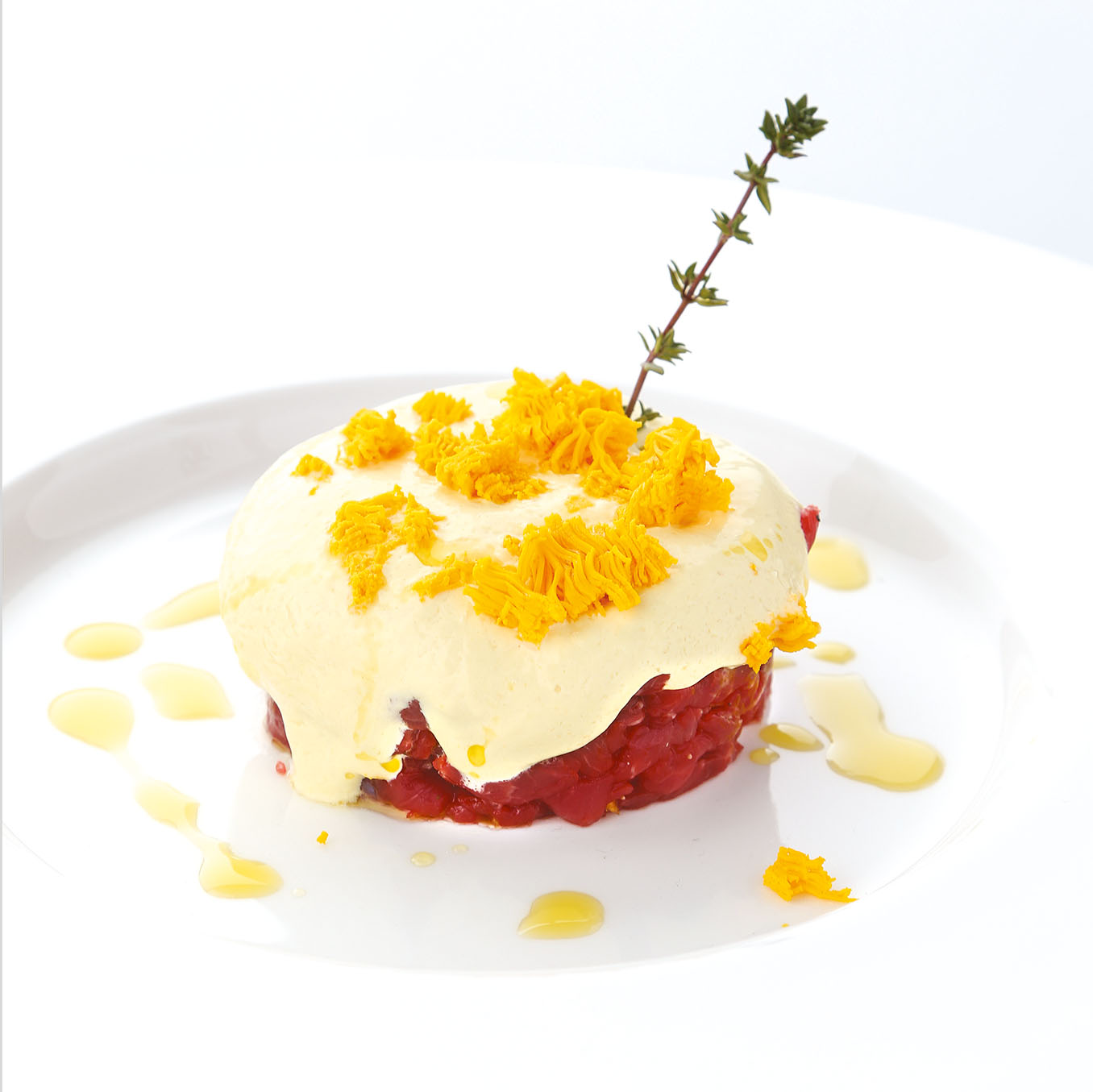 Al centro di un piatto porre un coppapasta e mettere la tartare di manzo, porre sopra il gelato alla senape e finire con la mimosa d’uovo ed un filo di olio di tonda iblea, un rametto di timo e una spolverata ancora di sale al limone e timo.