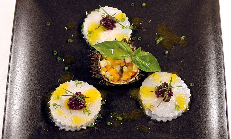 Ingredienti: g. 350 di ricciola freschissima, 8 ricci di mare, g. 50 di mango, g. 100 di verdure di stagione, 1 ciuffetto di erba cipollina, g. 25 di caviale, il succo di 1 limone, olio extravergine di oliva, sale e pepe.