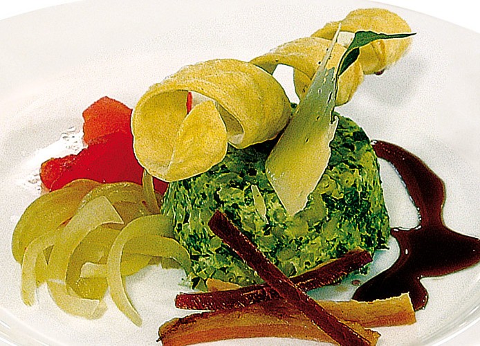 Procedimento: cuocere i bucatini spezzettati, raffreddare, unire la ricotta, la cicoriella spadellata, rettificare di sapore, porre in appositi stampini. Cuocere in forno con 20% di umidità.