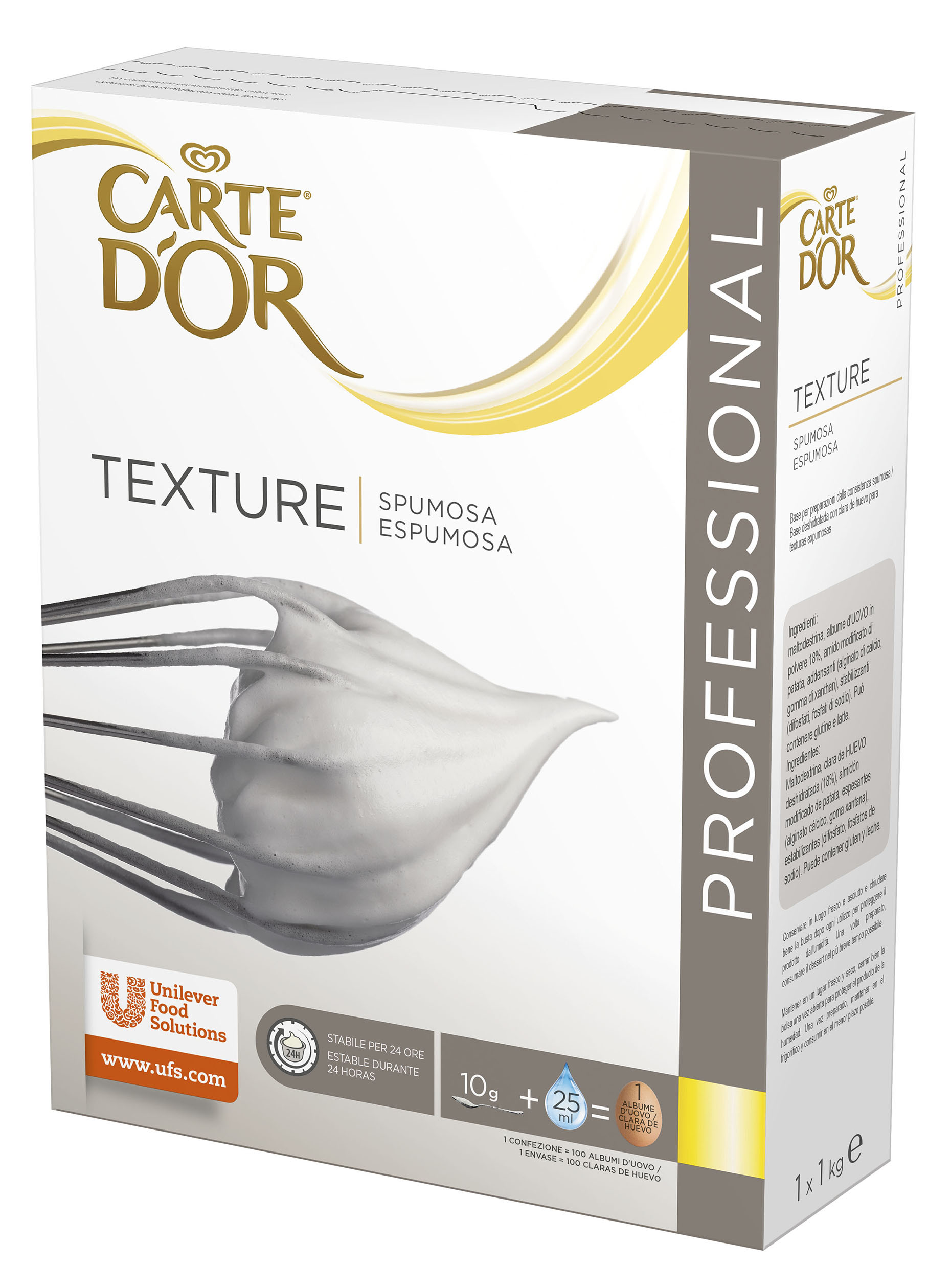Texture Carte d’Or Professional Spumosa è un preparato in polvere per la preparazione di basi spumose in sostituzione dell’albume d’uovo. Inodore e insapore, si monta con l’ausilio di acqua a temperatura ambiente in soli 5 minuti e non richiede l’aggiunta di zucchero o uova. È sufficiente versare il prodotto (seguendo le indicazioni sulla confezione) in un recipiente con acqua e montare fino a raggiungere la consistenza spumosa desiderata. Le spume realizzate con Texture Carte d’Or Professional Spumosa resistono nel tempo alla perdita d’aria e rinvigoriscono rimescolandole per pochi secondi. La stabilità dura fino a 24 ore. L’applicazione classica della Texture Spumosa è in pasticceria per la realizzazione di tutti i tipi di meringhe alla base dei principali dessert con consistenza spumosa quali mousse, dolci al cucchiaio, semifreddi, torroni, pan di spagna, macarons, semifreddi, dacquoise, genoise, soufflé. Il prodotto, in quanto inodore ed insapore, è perfetto anche per tante applicazioni salate come le mousse a base vegetale.