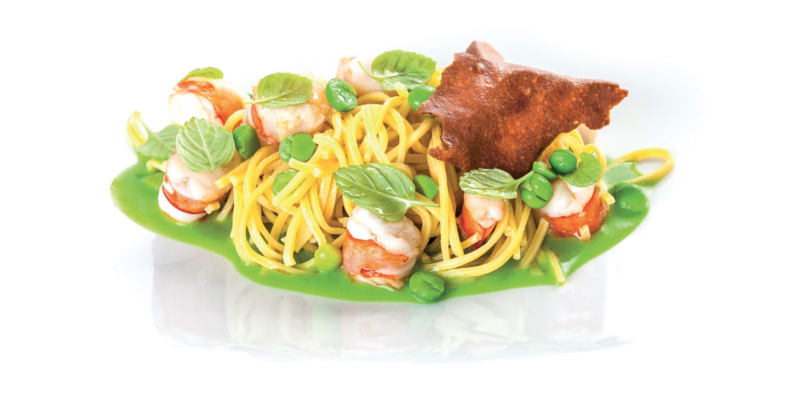 Preparare la pasta all’uovo con gli ingredienti sopra citati, avvolgere in pellicola e far riposare per 1 ora in frigo. Tirare la sfoglia ad uno spessore di 3-4 millimetri e lunga 30 centimetri, spolverare con della semola e fare asciugare per una decina di minuti, dopodiché tagliarla in spaghetti quadrati (troccoli); spolverare con altra semola e conservare. Frullare i piselli congelati con l’acqua bollente; quando risulterà fine, aggiungere il resto degli ingredienti, correggere di sale, se occorre, e passare al colino. In una padella rosolare l’aglio in olio extravergine, aggiungere i gamberi e cuocere a fuoco vivo per pochi secondi. Spegnere il fuoco e unire i piselli sgusciati, eliminare l’aglio e aggiustare di sale. Cuocere i troccoli in abbondante acqua salata, scolarli e insaporire con il sauté di gamberi.