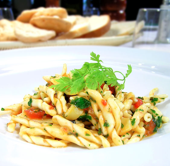 g. 300 di filetto di gallinella, g. 500 di pomodori rossi, g. 500 di semola di grano duro fine, g. 175 di acqua, g. 100 di farina, 1 bicchiere di vino bianco, 1 bustina di zafferano in stimi, 1 mazzo di prezzemolo, 1 spicchio di aglio, olio extravergine di oliva, sale, pepe quanto basta.